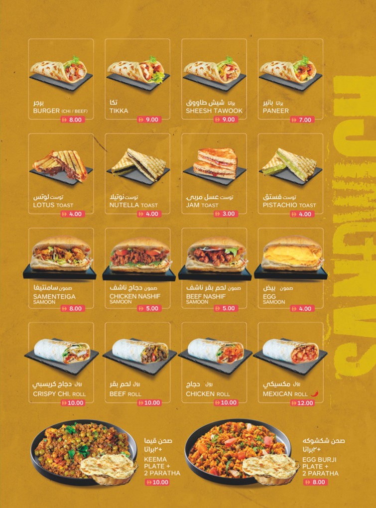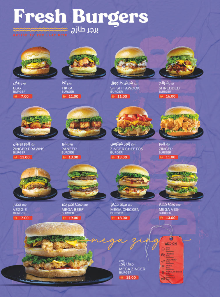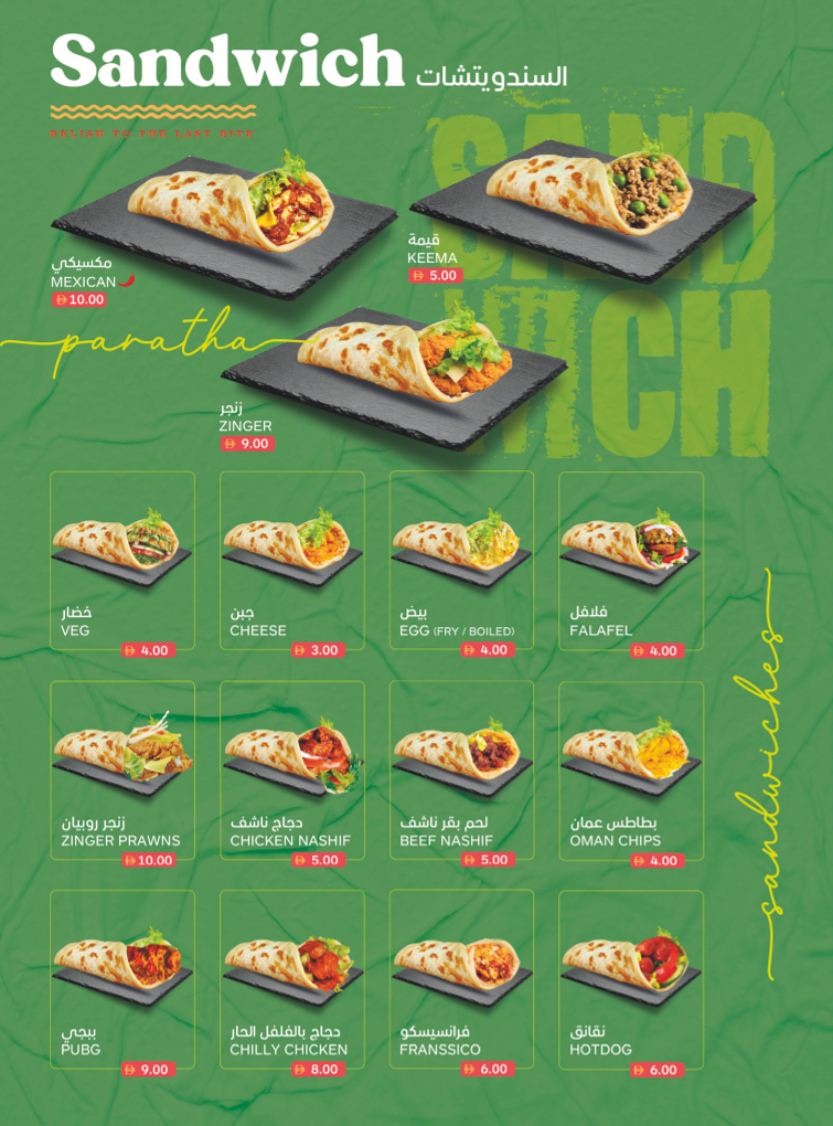 Sandwiches and Burgers: The menu includes a diverse selection of sandwiches and burgers, covering various fillings such as chicken, beef, veg, cheese, and egg. There are also options with specific preparations like Zinger, Falafel, Tikka, and Sheesh Tawook. Light snack items and fast food staples such as hotdogs and fries are also available within this category.