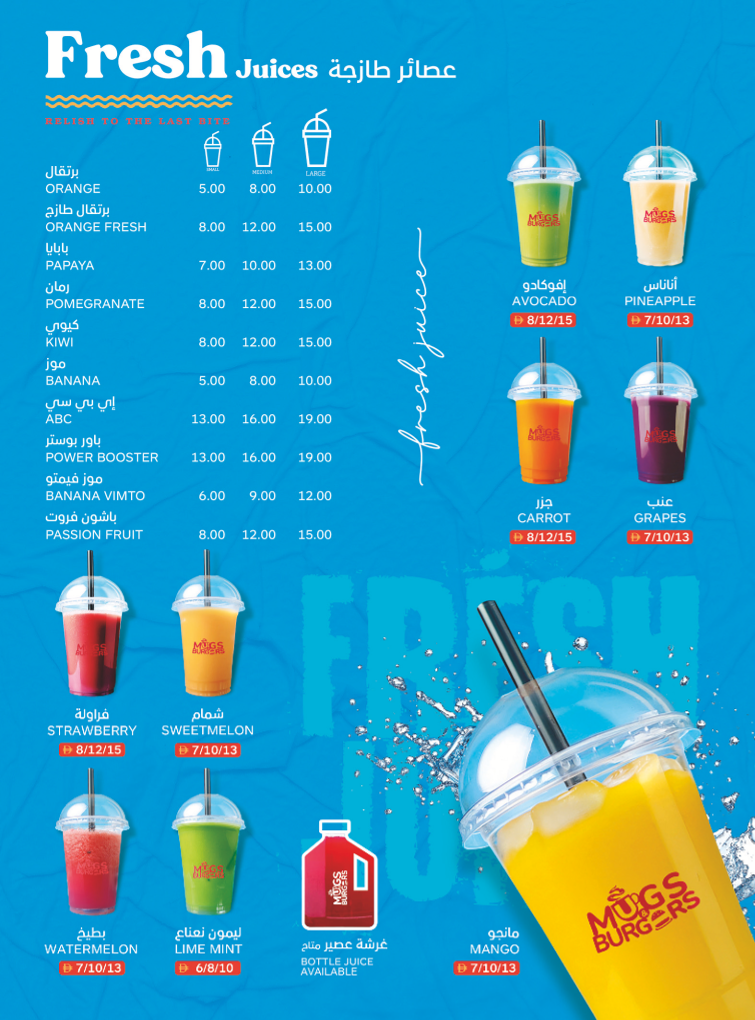 Fresh Juices and Special Juices: This section offers a range of freshly squeezed fruit juices available in multiple sizes, featuring options like orange, papaya, pomegranate, and kiwi. Additionally, there are unique special juice blends and shakes such as mango shake, strawberry shake, and several signature cocktails with creative names.
